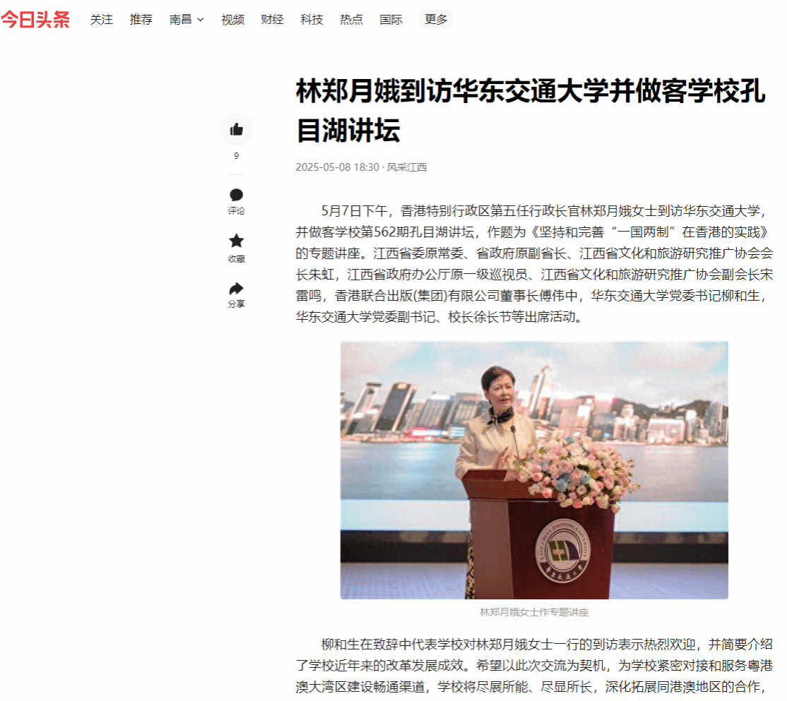 5月7日下午,香港特別行政區第五任行政長官林鄭月娥女士到訪華東交通大學,并做客學校第562期孔目湖講壇,作題為《堅持和完善“一國兩制”在香港的實踐》的專題講座。江西省委原常委、省政府原副省長、江西省文化和旅游研究推廣協會會長朱虹,江西省政府辦公廳原一級巡視員、江西省文化和旅游研究推廣協會副會長宋雷鳴,香港聯合出版(集團)有限公司董事長傅偉中,華東交通大學黨委書記柳和生,華東交通大學黨委副書記、校長徐長節等出席活動。
